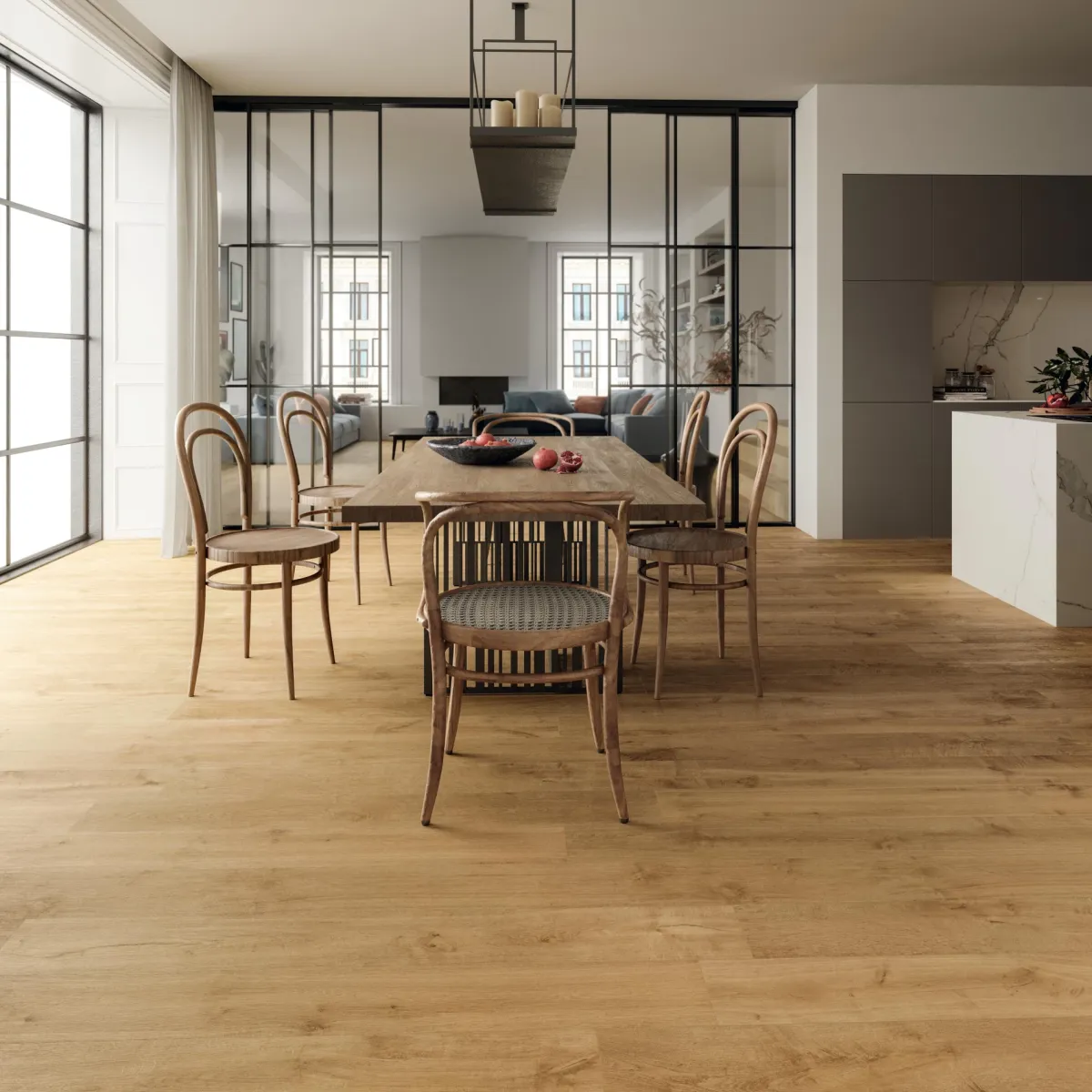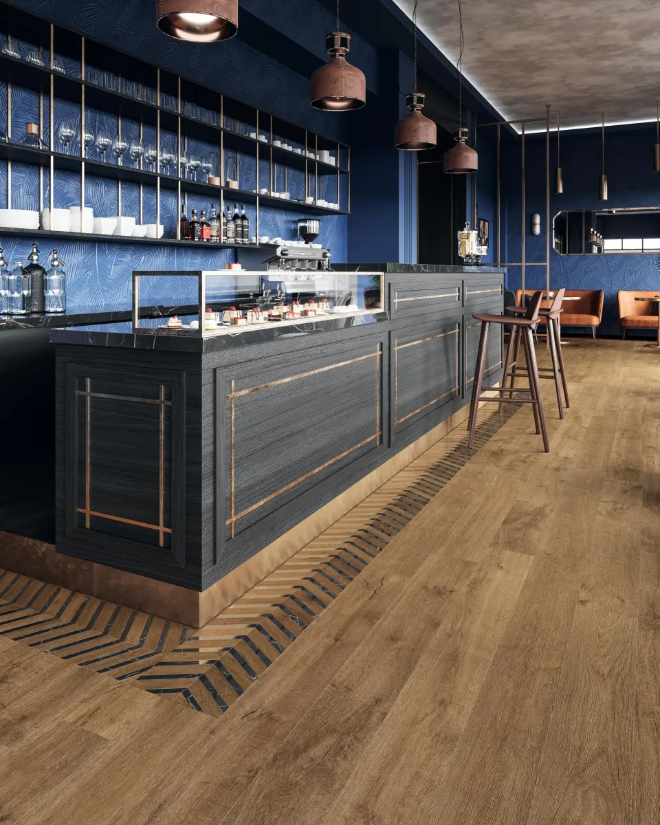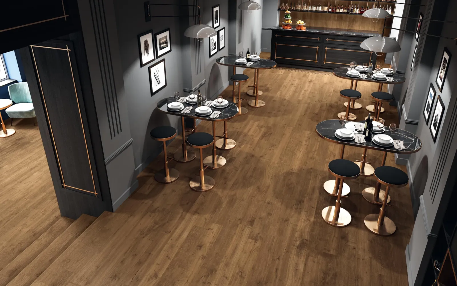 Ce plancher effet bois représenté est disponible dans des tons du brun intense, blond, miel et ambre. Toutes ces couleurs viendront apporter élégance et chaleur naturelles à votre intérieur pour un effet parquet réinterpréter à la perfection.