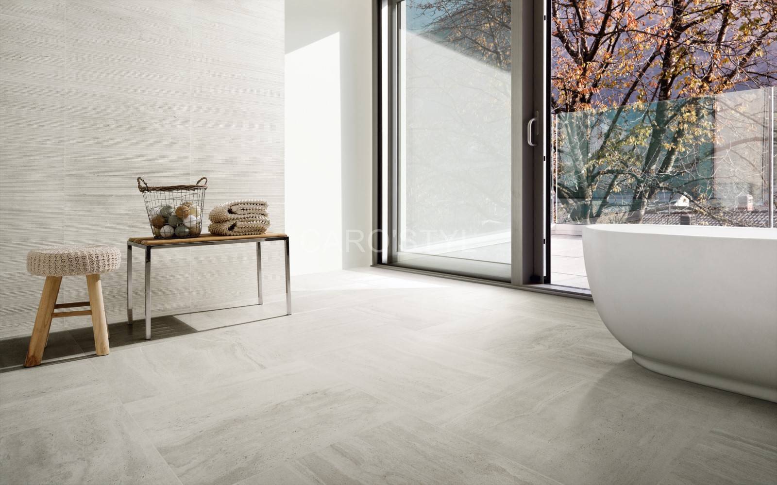 Intemporelle, cette série de carrelages en grès cérame White à St Tropez réinterprète le graphisme du travertin partiellement imparfait ce qui donne un effet de pierre naturelle. On observe sur ce carreau des nuances de blancs et de gris qui donnent une douceur visuelle à St Tropez.
