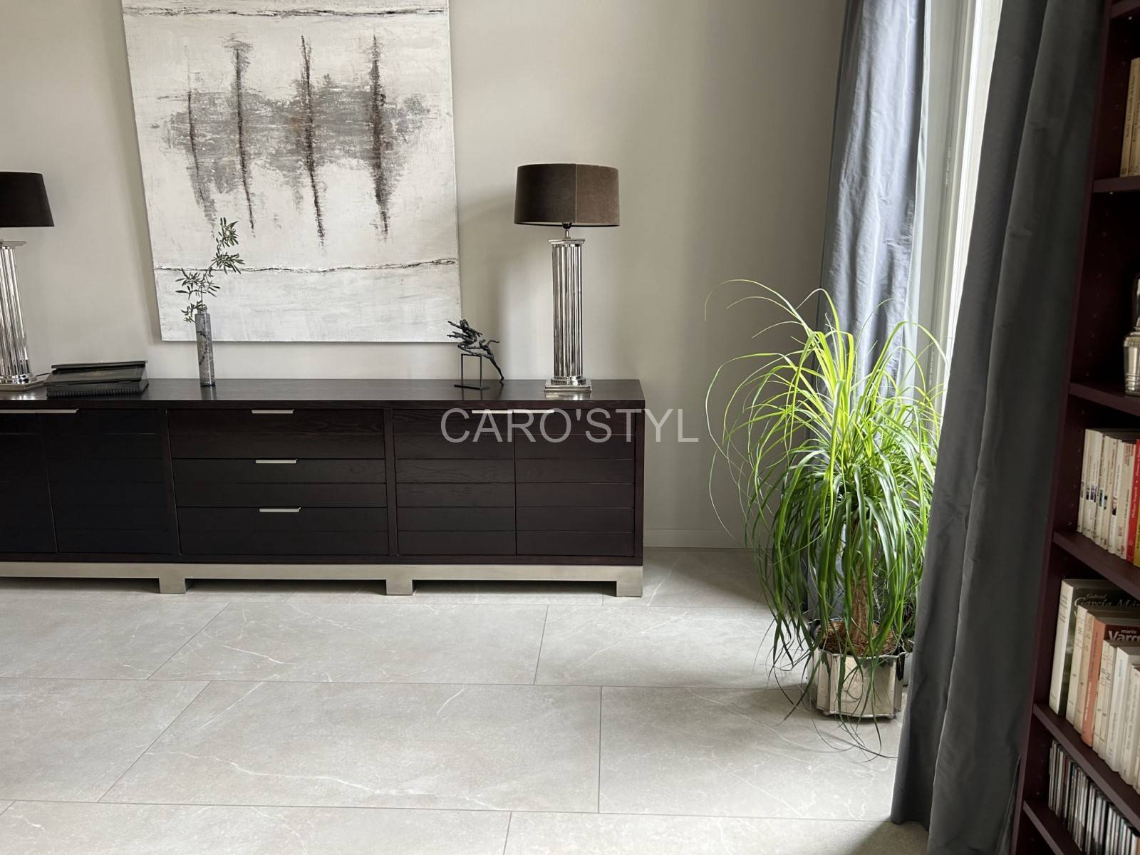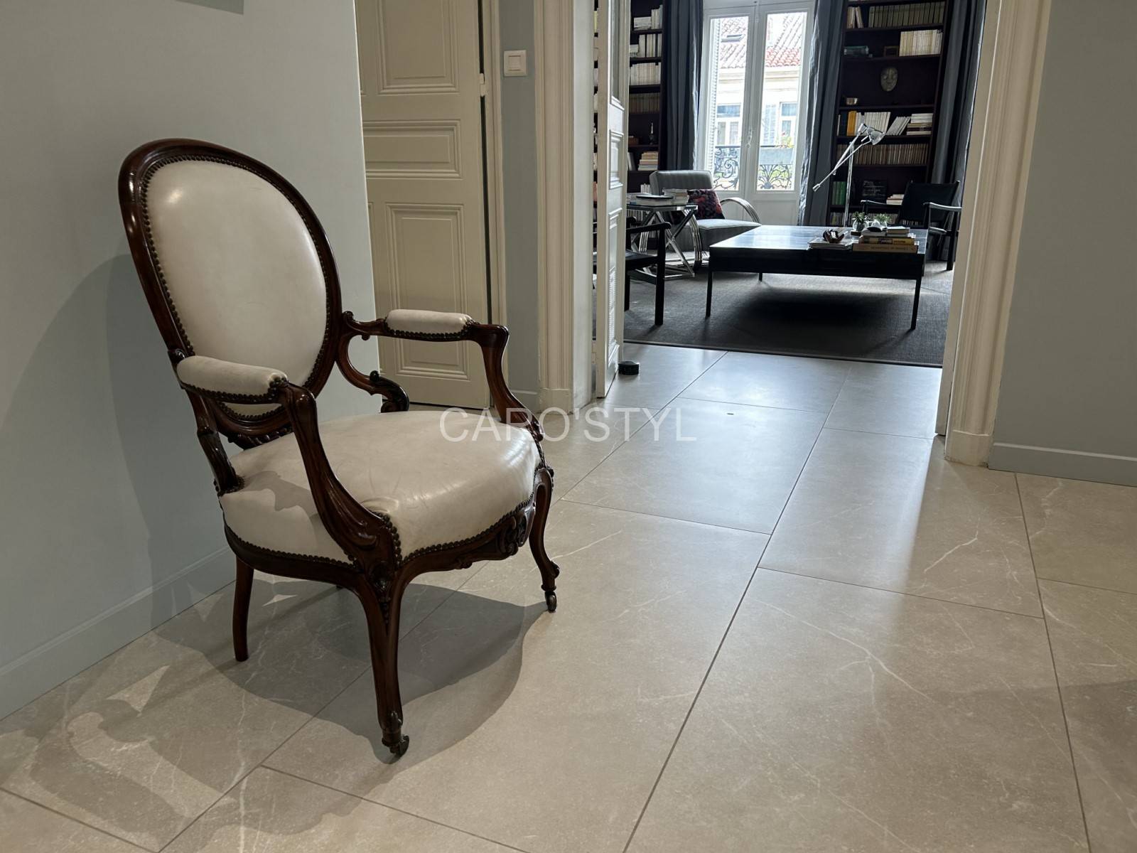 Découvrez notre carrelage en grès cérame imitation marbre à la finition satinée au travers de cette rénovation réalisée dans un appartement haussmannien à Toulon.
