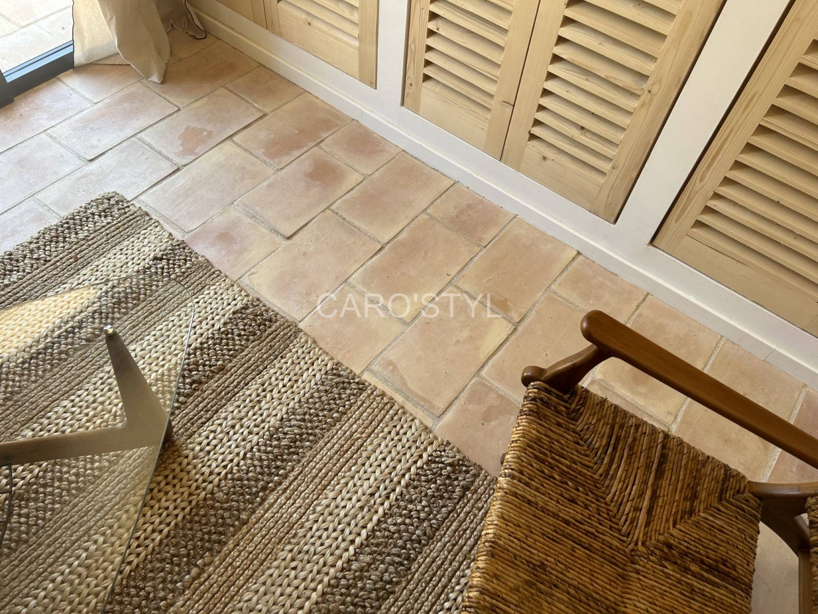 Les carreaux authentiques en terre cuite sont à traiter avec un produit spécifique pour les protéger des aléas du quotidien, un produit cirant pourra être apposé pour offrir une patine digne d’un sol intérieur ancien.