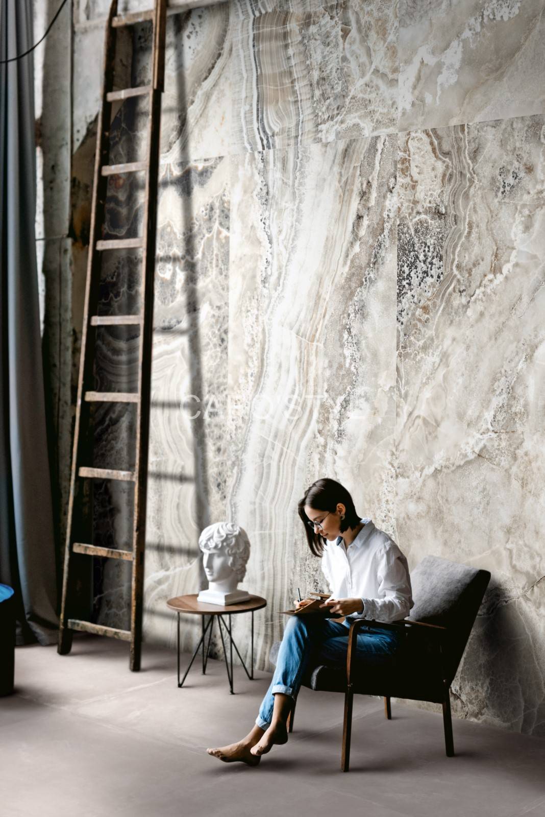 Imola The Room Black Dahlia provient d’Amérique centrale. C’est une pierre appartenant à la catégorie des onyx silicatés. Ce carrelage possède de nombreux détails et nuances différentes : noir avec des stries blanches, un veinage variant du jaune au brun, en passant par l’ivoire et le gris.