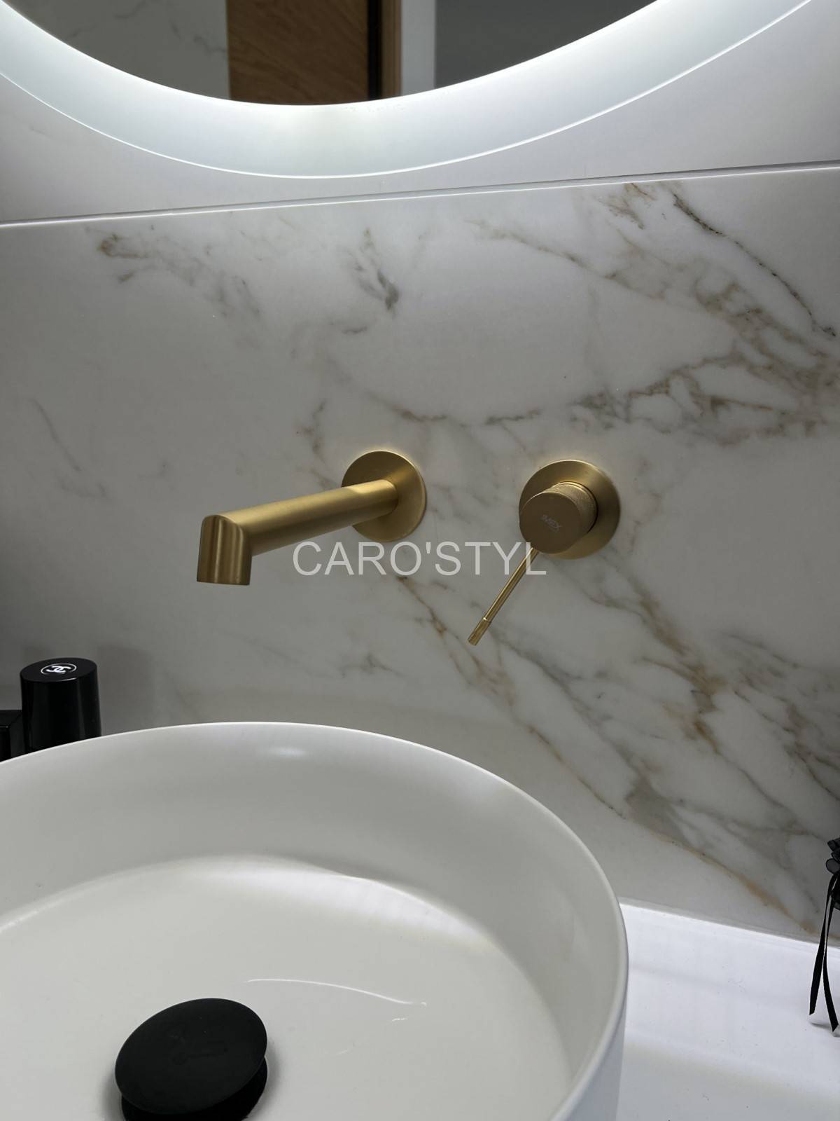 Dans cette fabuleuse réalisation, vous retrouverez une alliance de matériaux élégante avec ce carreau. Une robinetterie de choix, composée d’or brossée pour faire un rappel du veinage de notre carrelage Calacatta Gold.