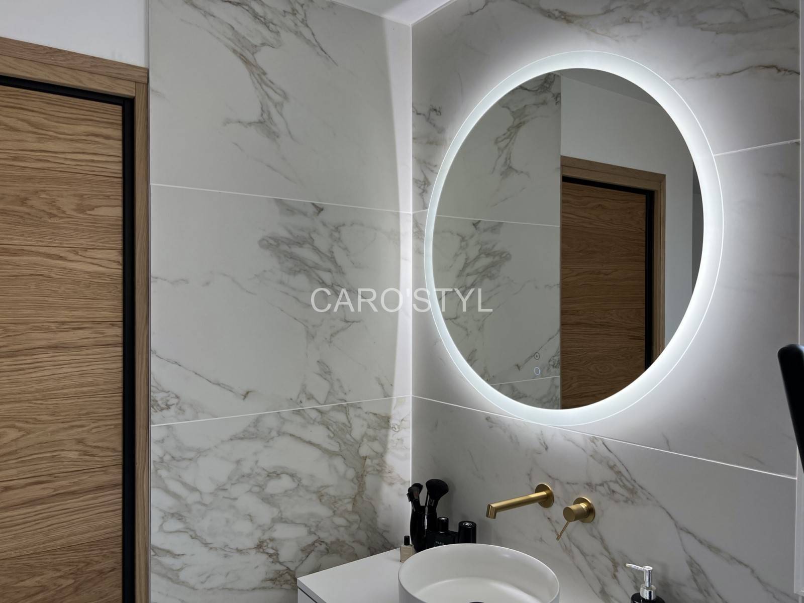 De plus, nous retrouvons un miroir rétroéclairé moderne qui va suivre les lignes épurées de ce marbre.