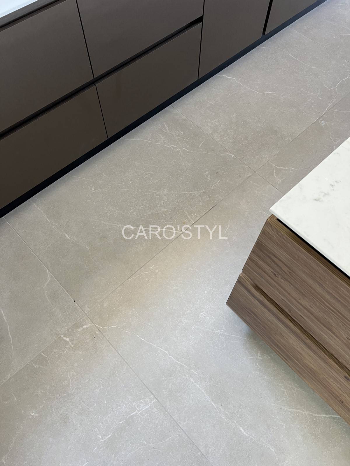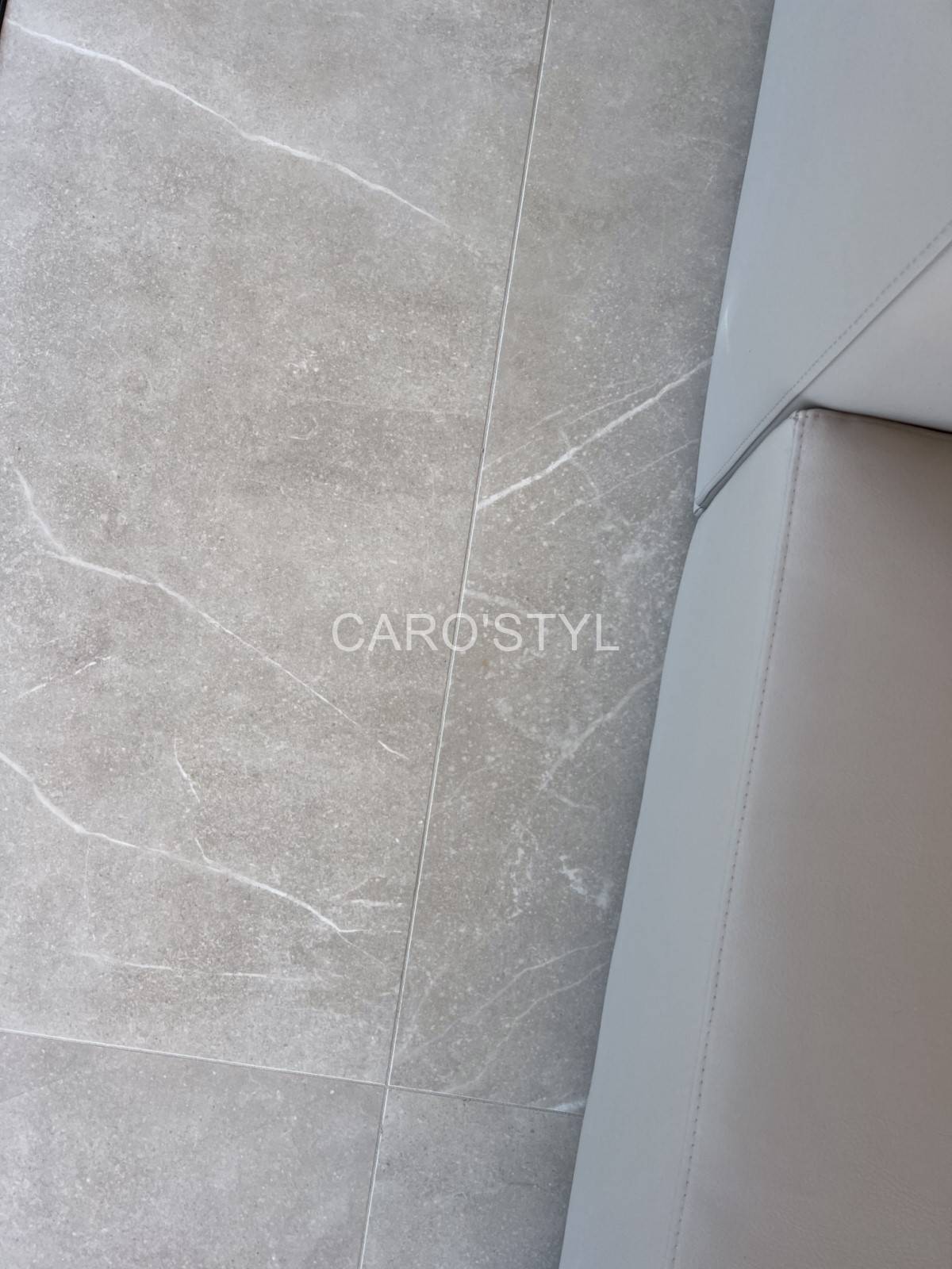 Notre carrelage Tau Ceramica Soapstone se trouve au format 120x120cm dans cette réalisation. Ce grand format agrandira votre pièce et y apportera de la profondeur.