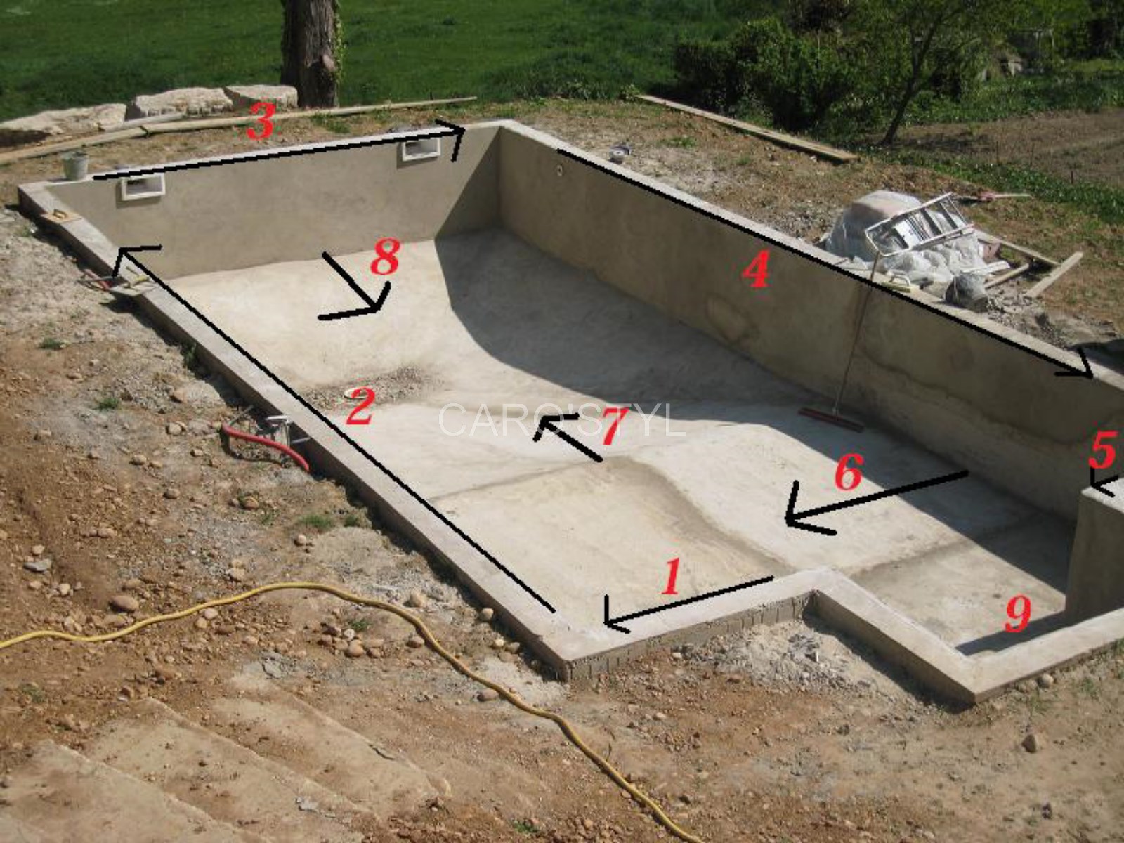 -Commencer par carreler le pourtour de la piscine, en commencant par un angle, ensuite les parois en partant du bas vers le haut, pour le sol on commence par la surface plane et on finit par les marches (pour sortir plus facilement).