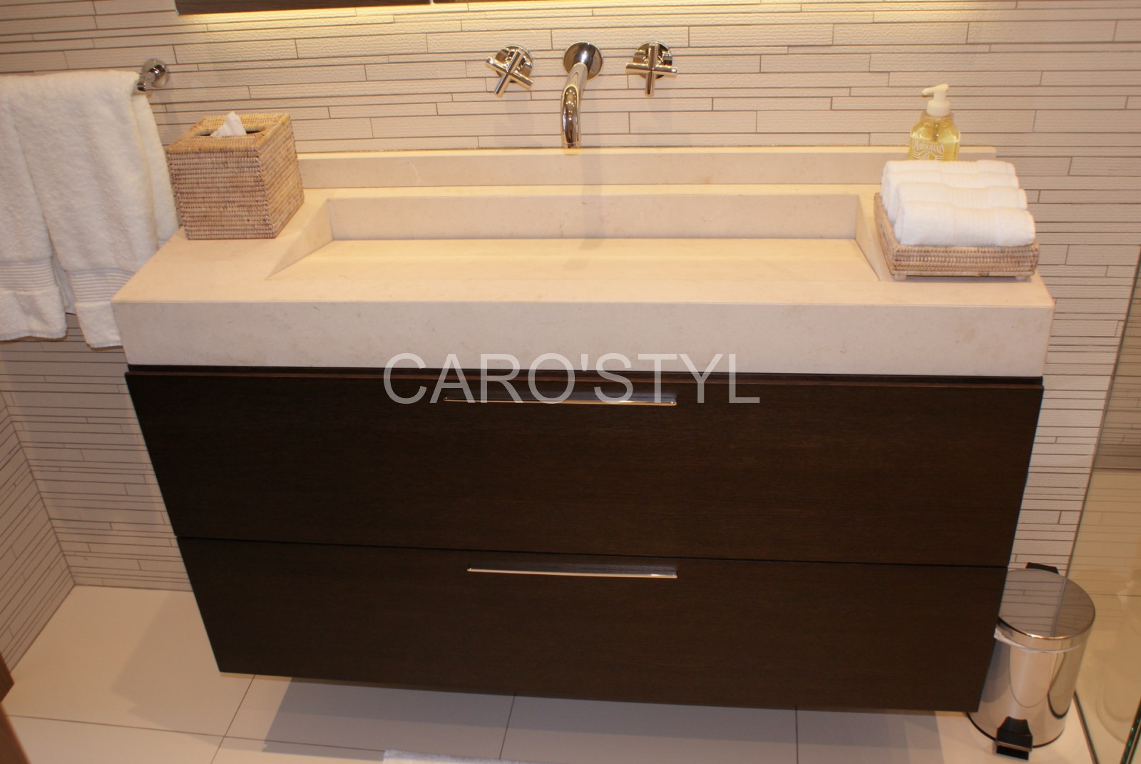 une vasque en pierre blanche, a évacuation frontale dite "quickdrain",au travers d'un long joint creux en fond de vasque, avec une pente douce,adaptée a un meuble en bois idéal de discrétion .