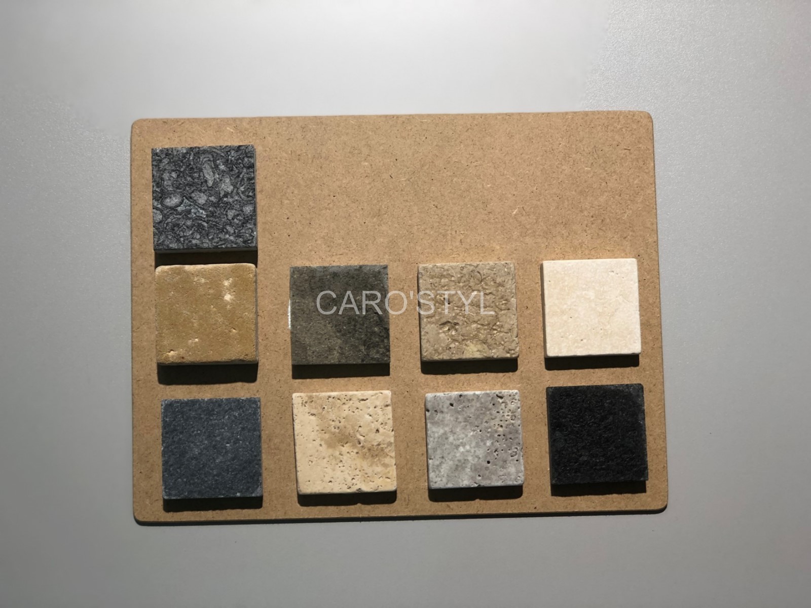 Nous vous proposons des échantillons de divers carrelages et de diverses margelles en pierres naturelles. Tous ces échantillons sont positionnés sur une jolie plaquette avec une photo d'une réalisation et d'un carreau 10X10. Cet échantillon vous parviendra en colissimo par la poste.