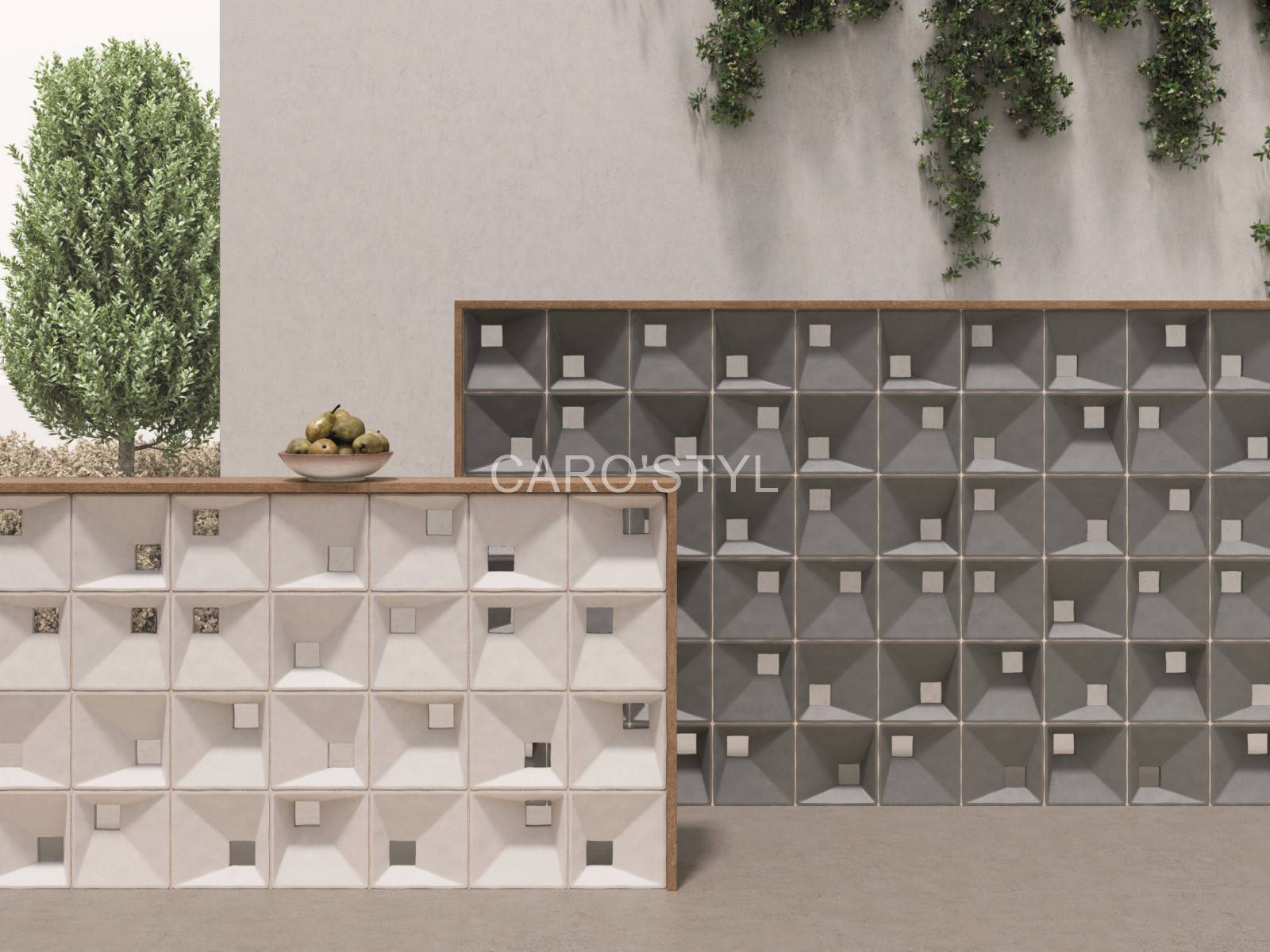 Le format de notre claustra Castello by Dsignio Harmony est disponible en 20,5x20,5cm dans 3 coloris différents : blanc, gris, brique. De multiples lumières apparaitront grâce aux ouvertures multiples et aléatoires de nos claustras.