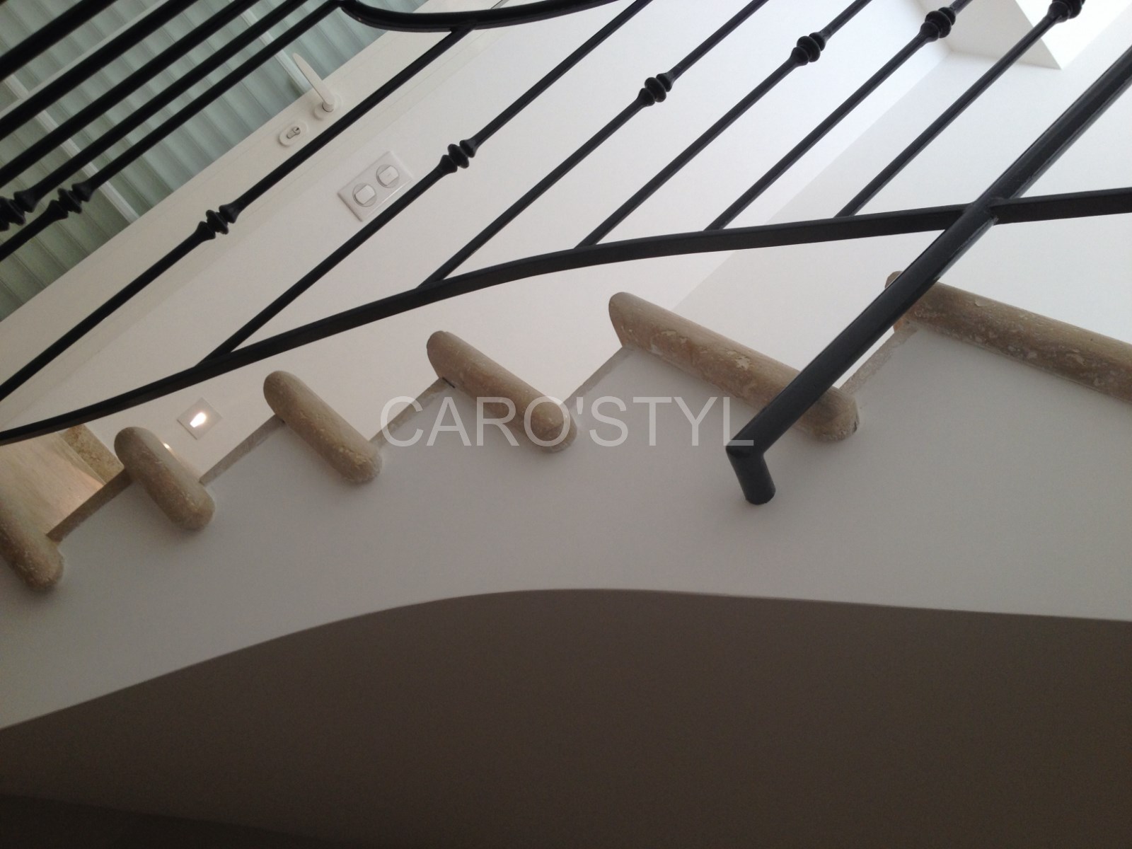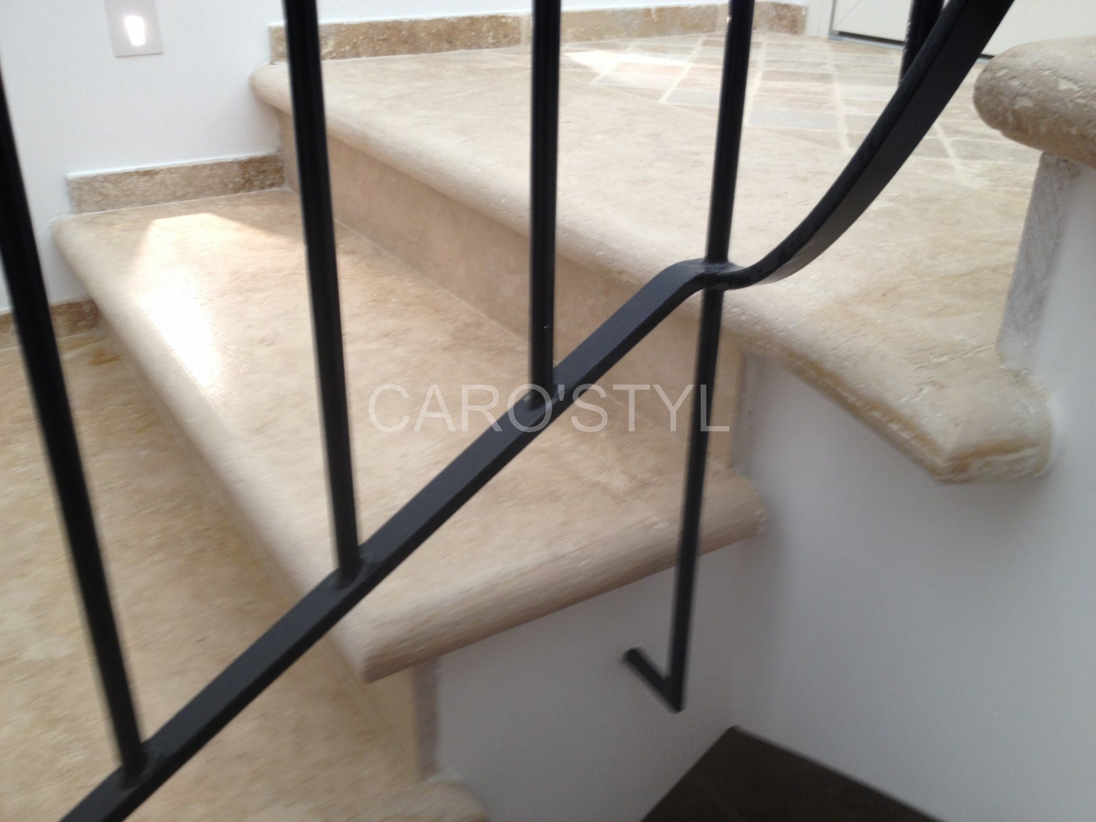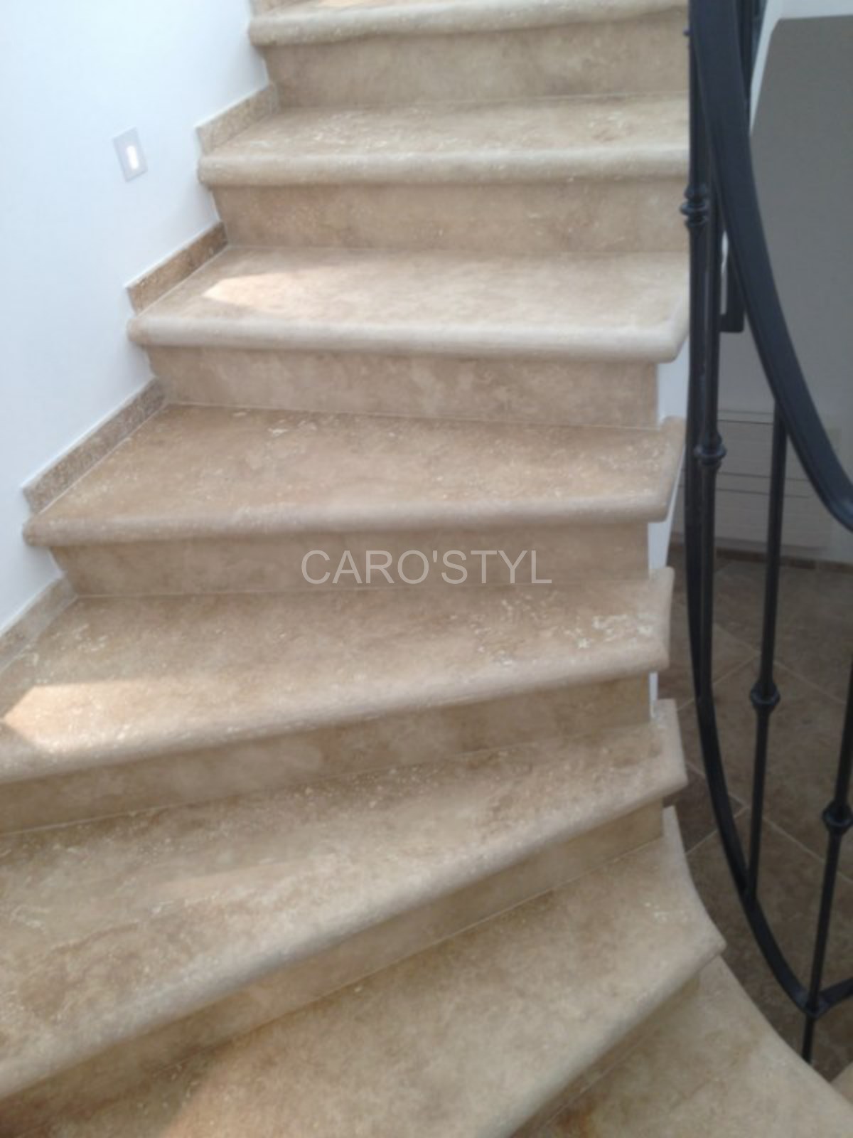 Ici un escalier en pierre naturelle travertin beige, épaisseur 5 cm, avec une finition demi-rond sur l'avant, très cossu !