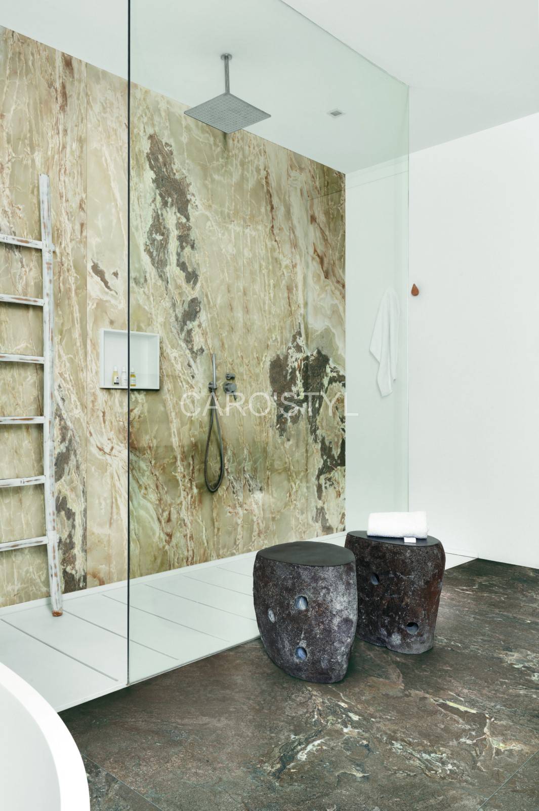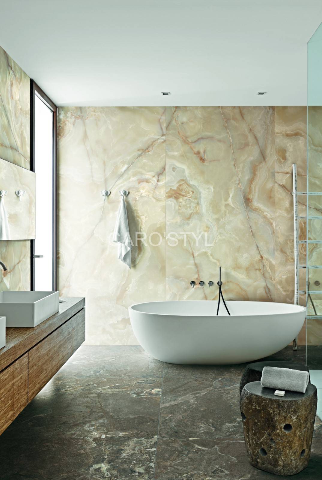 Cette série grès cérame, est faite de la rencontre entre 2 matériaux insolites : l’onyx et le porphyre, pour ne laisser place qu’à l’élégance et l’harmonie parfaite des mélanges chromatiques, remplis de douceur pour des lieux raffinés.