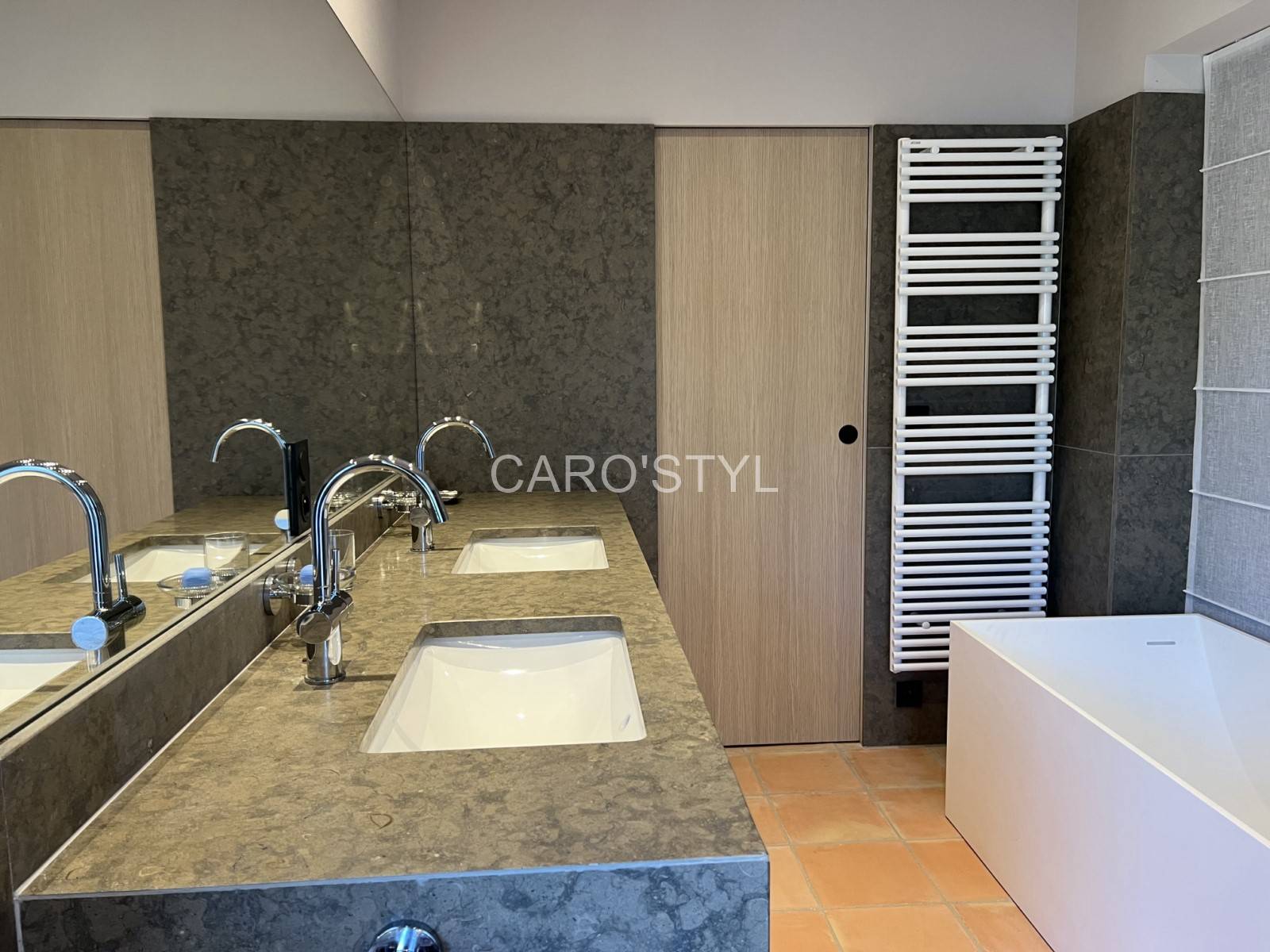 Appréciez un plan de toilette en pierre, lisse à souhait, facile d'entretien.