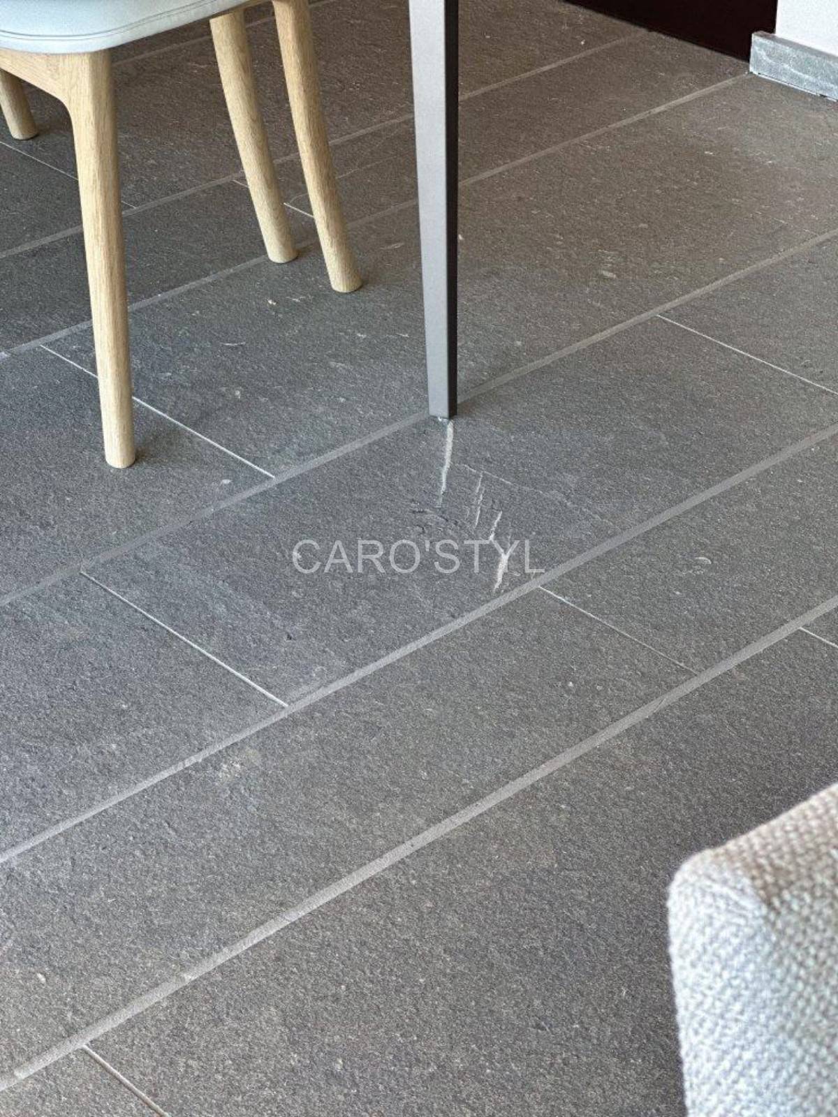 Ici en finition flammée légèrement structurée, la pierre naturelle de Cenia grise existe également en finition brossée et adoucie...