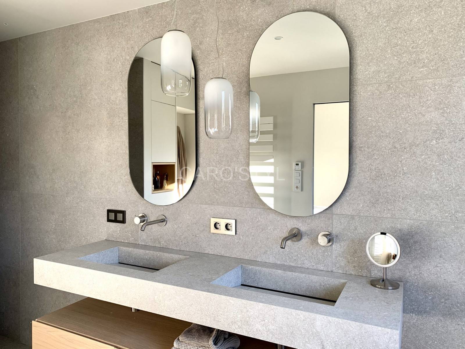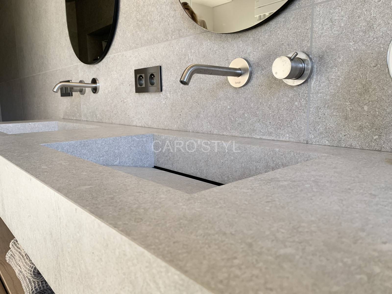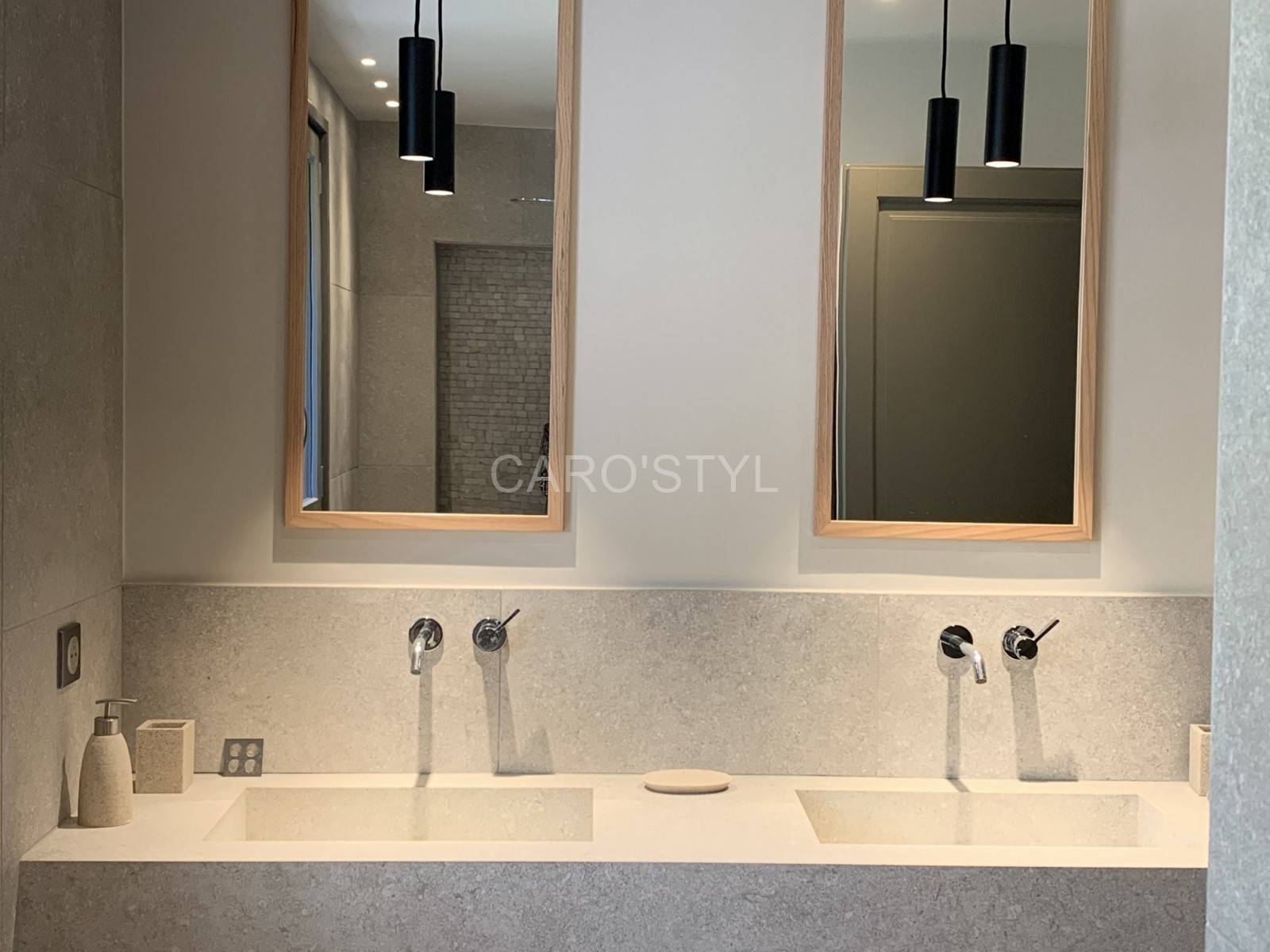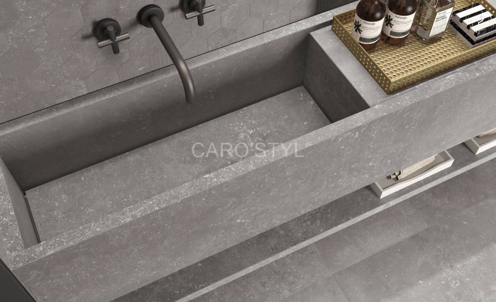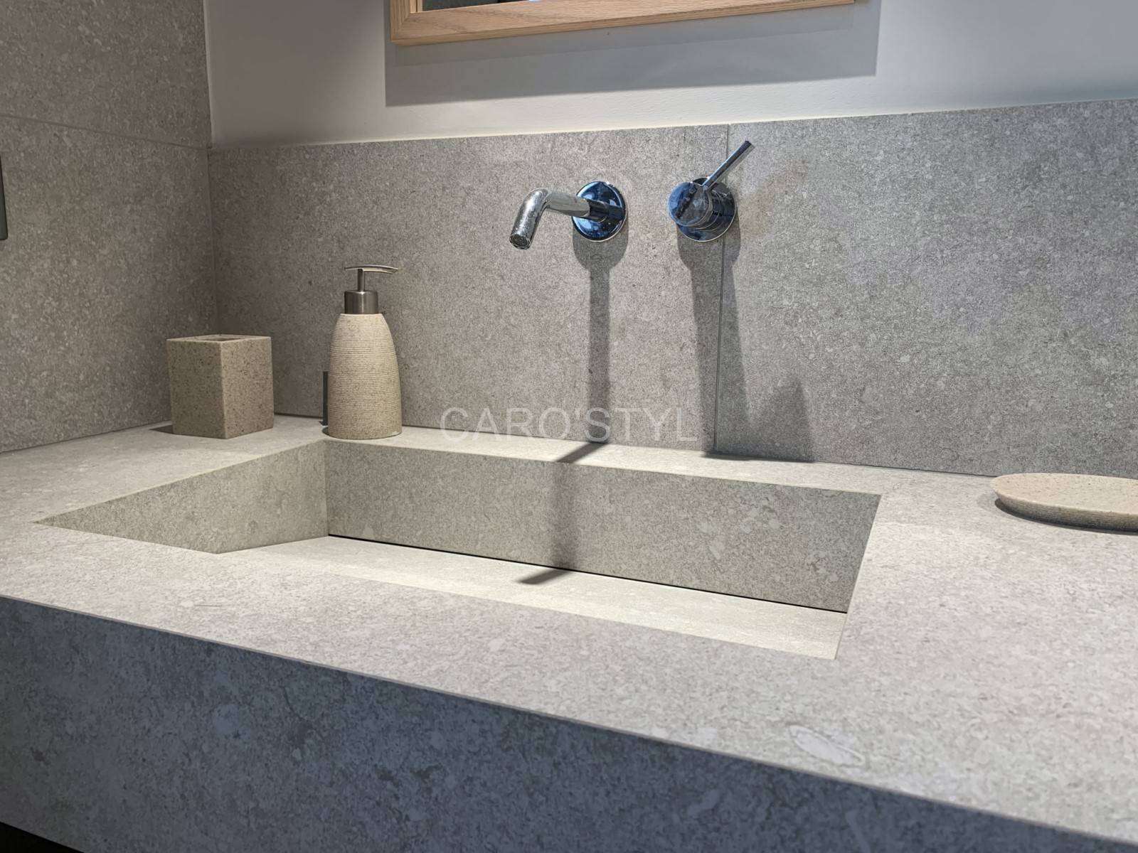 Caro’Styl a réalisé cette salle de bain à Cassis et a travaillé avec son fournisseur Kronos ceramiche. La vasque en grès cérame de la série Reverse contient des éléments naturels tels que la pierre. Cette vasque Reverve de chez Kronos ceramiche fait appel à l’ancien , passé par le temps ce qui fait rappeler l’époque Antique.