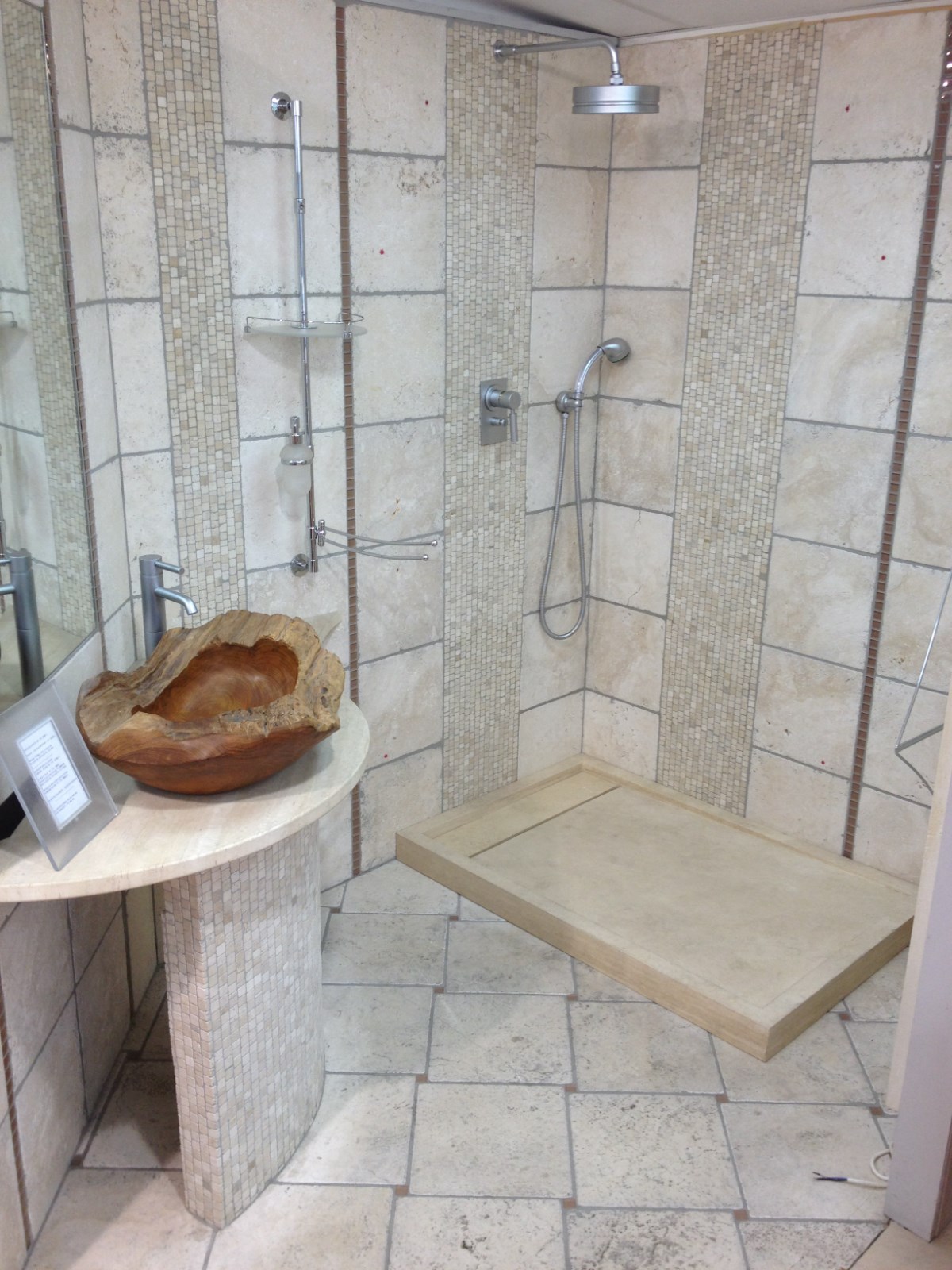 Une vasque, un plan de toilette, un receveur de douche en travertin, les murs en 30x30, nous pouvons réaliser tous vos désirs avec cette pierre naturelle qui se plie à toutes vos envies.