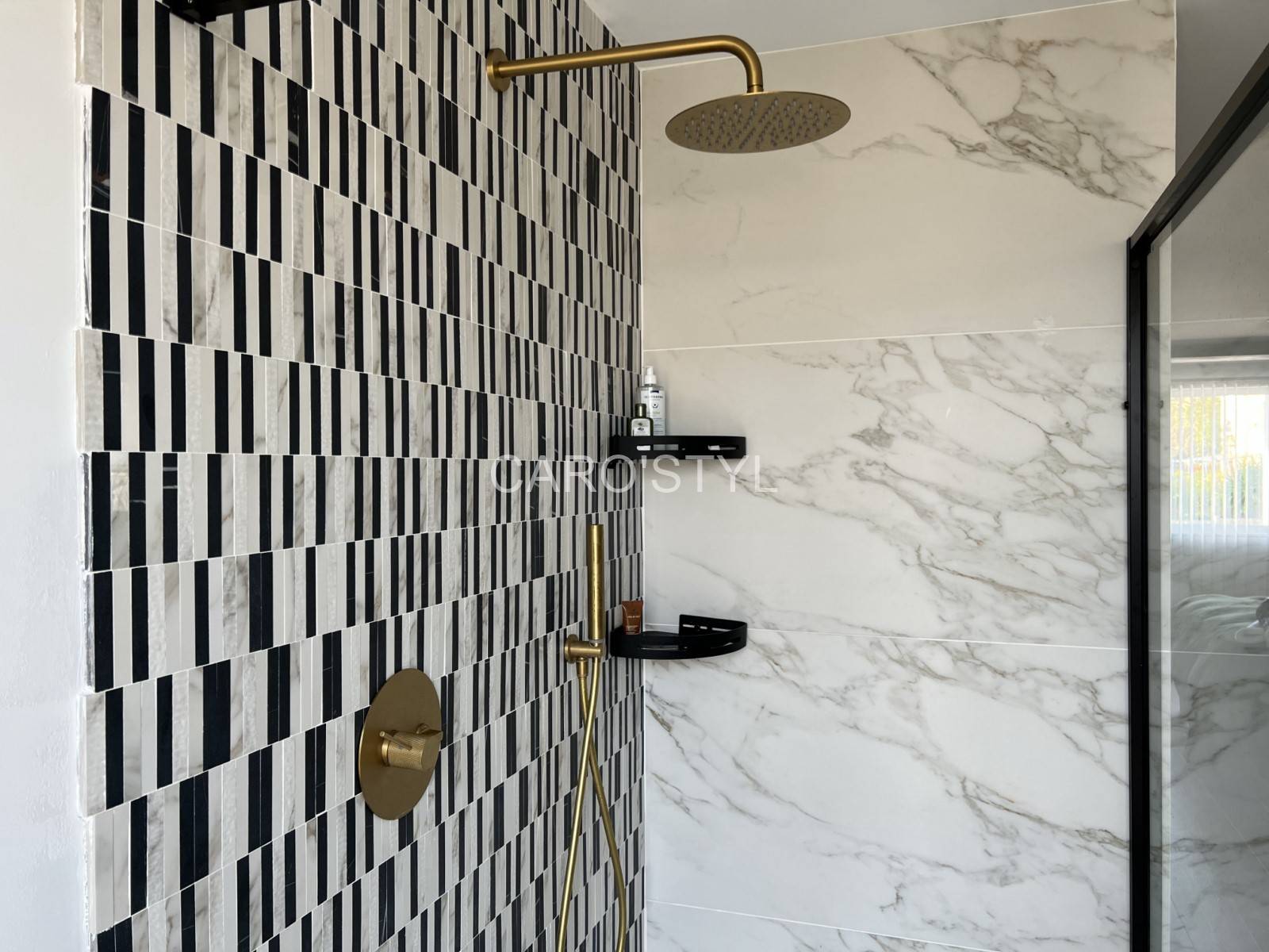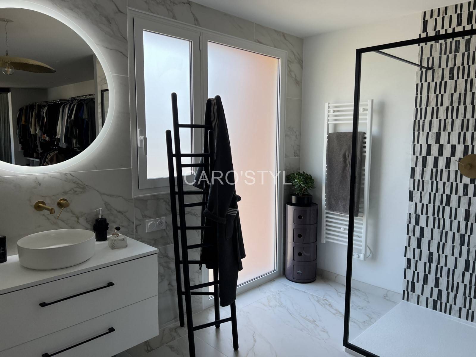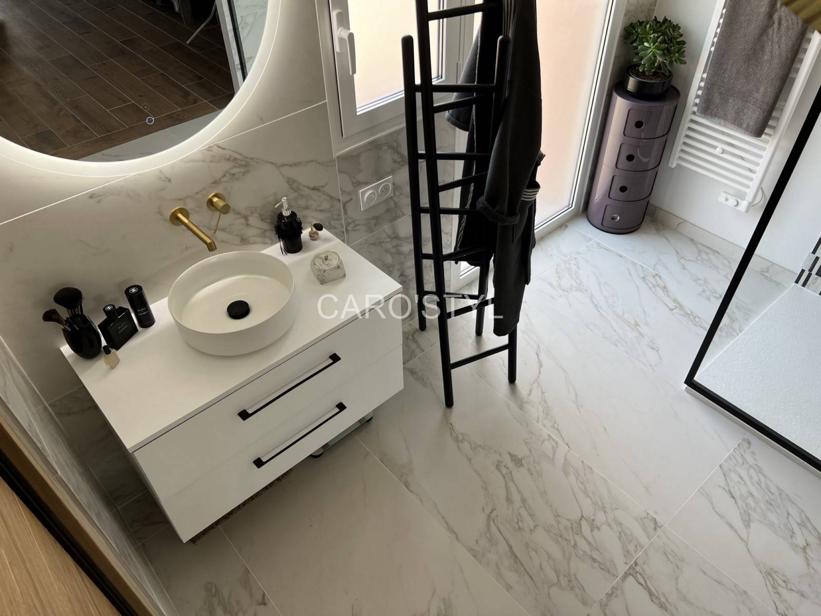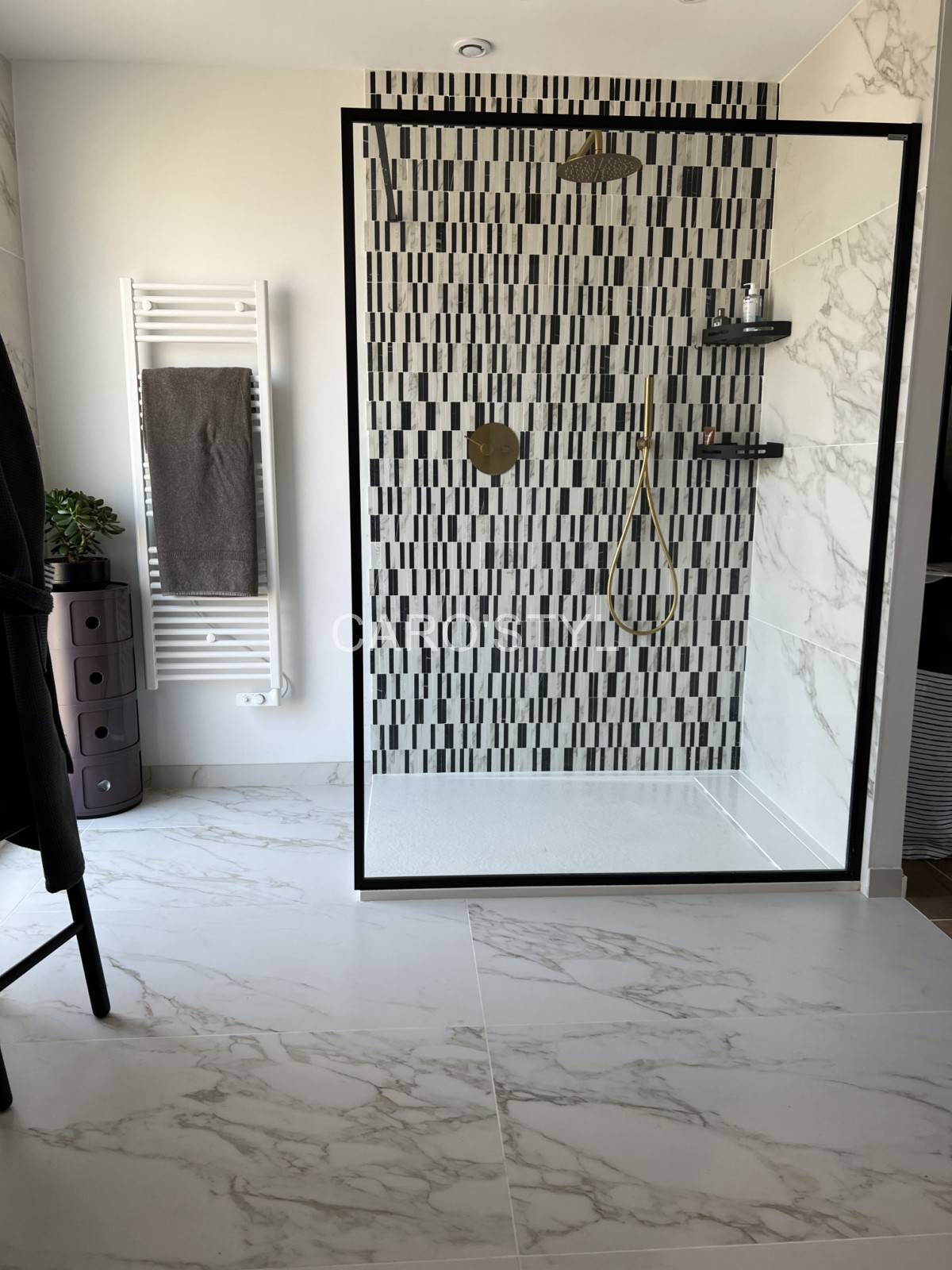 Dans cette très belle salle de bain, les murs et le sol ont été ornés d’un carrelage grand format d’exception aux fines marbrures.