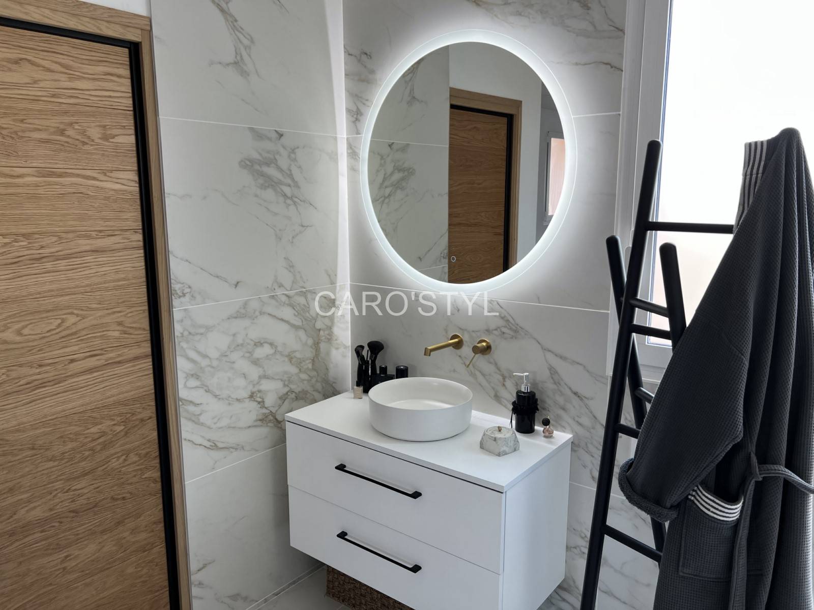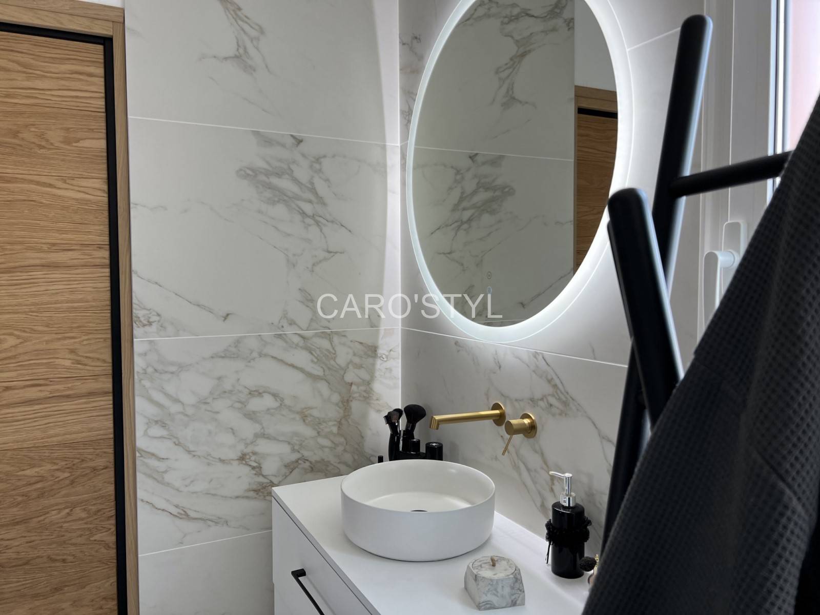 Ses fines marbrures grises aux nuances dorées alliées à sa surface blanche (mate ou satinée) renvoient une luminosité enveloppante et délicate.