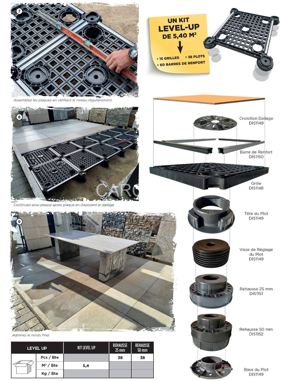 Le système LEVEL UP vous permettra donc, de surélever votre revêtement. Qu'il s'agisse de pierre naturelle pour l'extérieur, de grés cérame ou d'autre type de revêtement.. Ce système de pose s'adapte à tous les projets !
