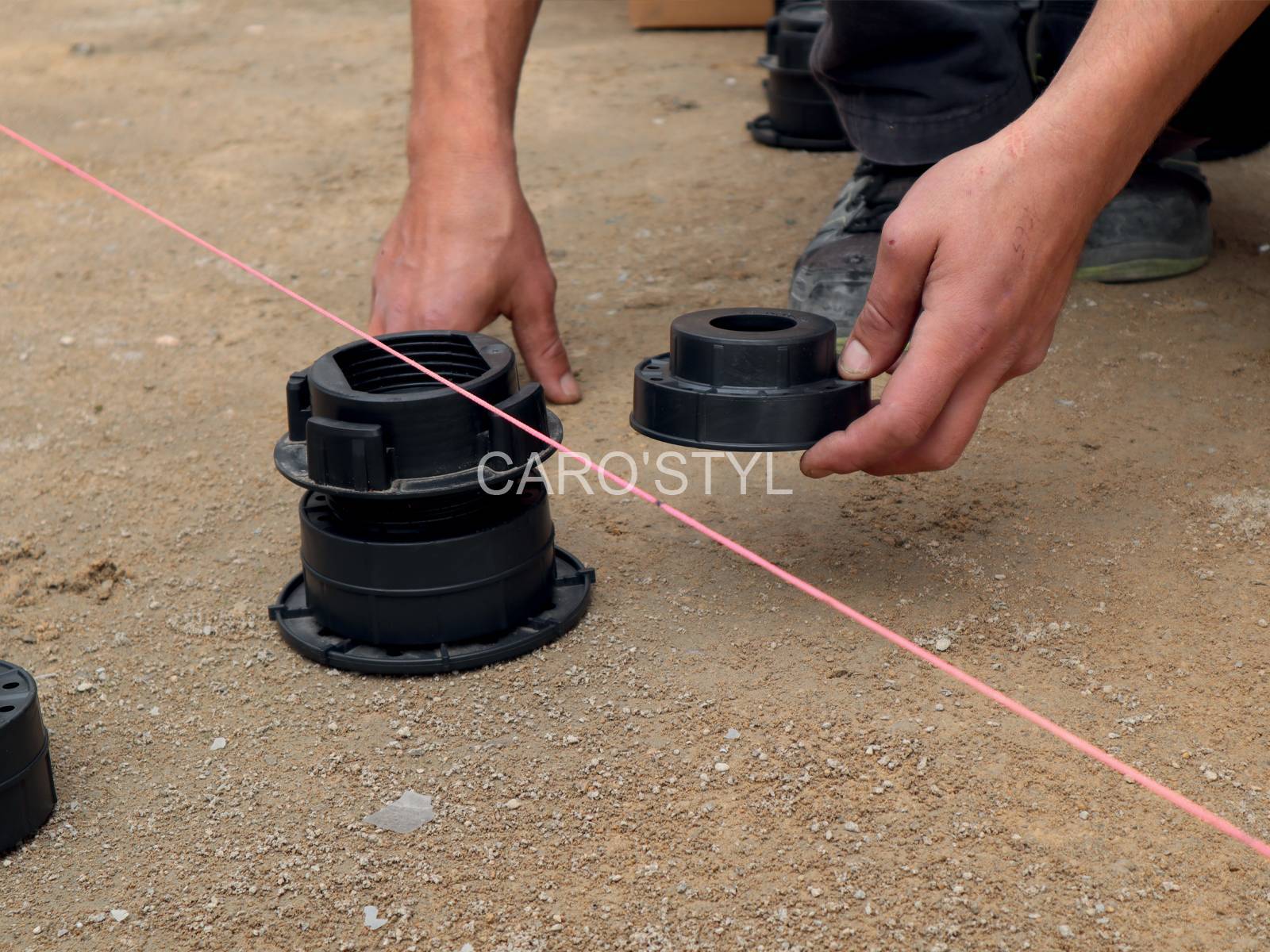 L'espace entre le sol et votre terrasse permettra plusieurs choses : Il permettra de faire passer différents tuyaux et câbles si besoin. Le fait de surélever un plancher permet également d'évacuer très facilement les eaux. Vous n'avez plus besoin de couler du béton, les plots réglables sont adaptés aux différents extérieurs.