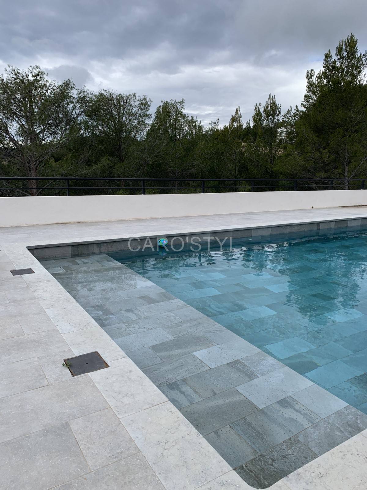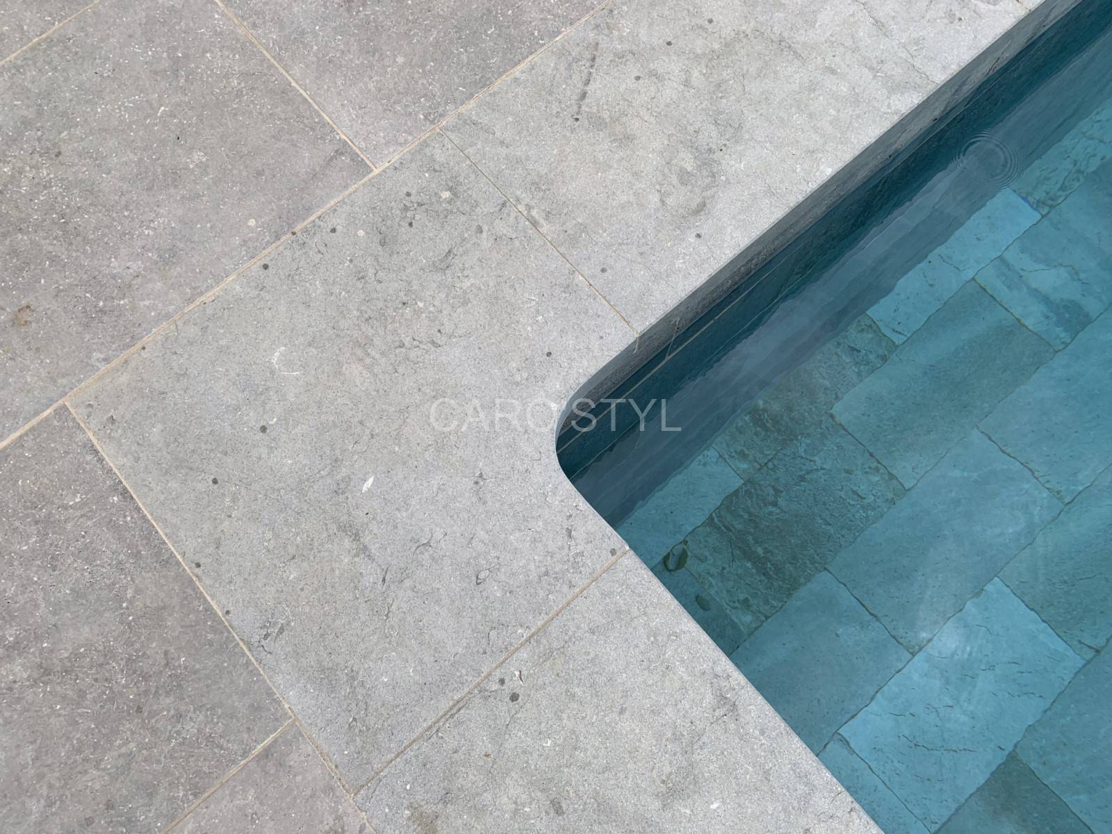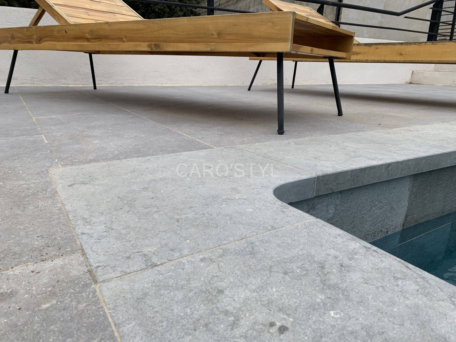 Concernant la grande piscine, nous avons opté pour du carrelage bali grey format 30X60. Autour, nous retrouvons de la margelle Barcelone grise avec les angles aux bords arrondis. La plage de piscine est faite avec un merveilleux carrelage appelé limestone gris, effet calcaire que l’on retrouve ici en format 40X80 cm et donne un effet rivière naturelle.