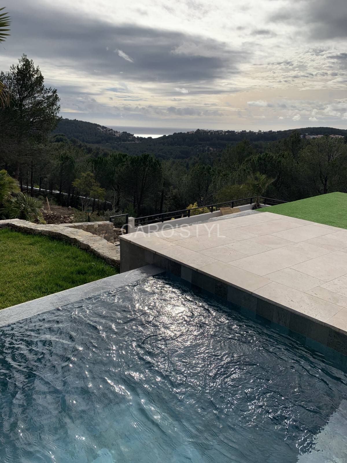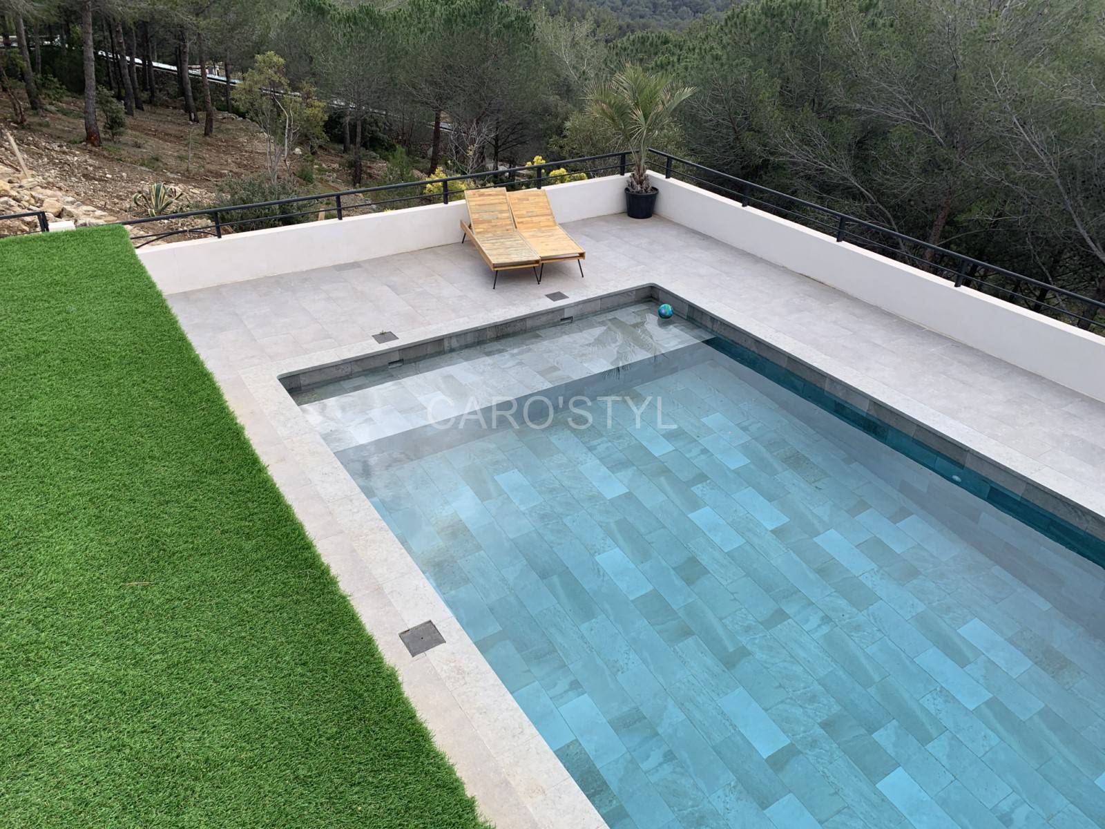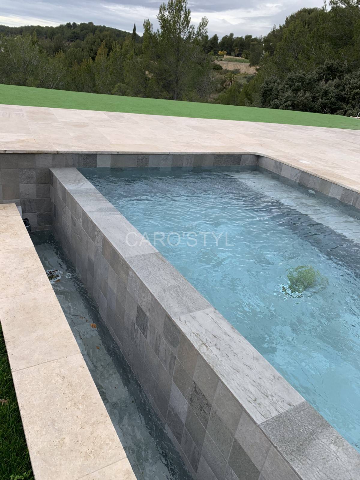 Concernant la grande piscine, nous avons opté pour du carrelage bali grey format 30X60. Autour, nous retrouvons de la margelle Barcelone grise avec les angles aux bords arrondis. La plage de piscine est faite avec un merveilleux carrelage appelé limestone gris, effet calcaire que l’on retrouve ici en format 40X80 cm et donne un effet rivière naturelle.
